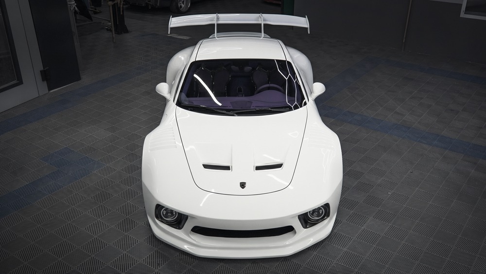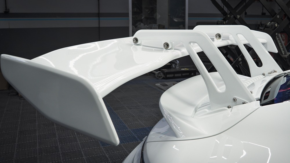 At the rear, a large swan neck wing is mounted directly to structural suspension elements and paired with a 210 cm (82.5-inch) carbon spoiler. The entire exterior is finished in a bespoke white paint known as Indecent “The Whitest”.