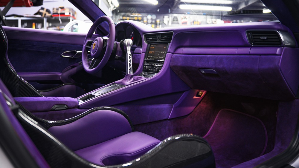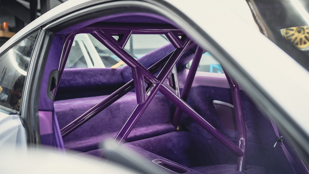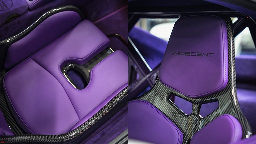 Inside, the vehicle continues the same obsessive attention to detail. Carbon bucket seats and the entire cabin are finished in purple leather and Alcantara, complemented by a bolted roll cage. The interior creates a bold contrast against the white exterior while maintaining a cohesive and performance-focused atmosphere.