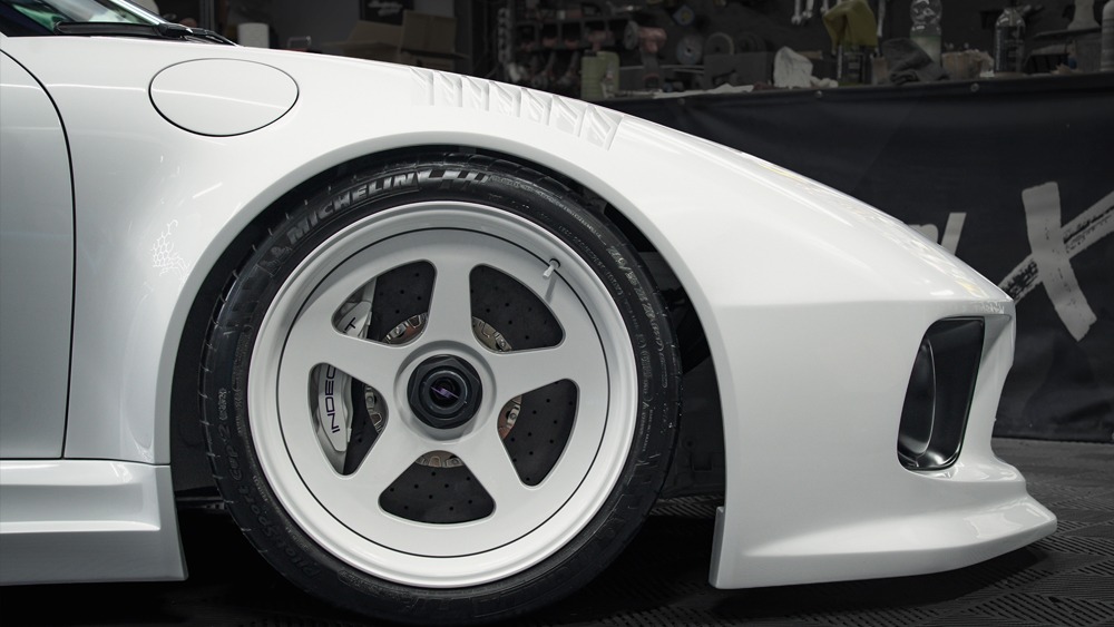 The body features the signature Indecent widebody conversion, defined not only by its dramatic proportions but also by a slantnose front end with integrated LED headlights relocated to the front bumper.
